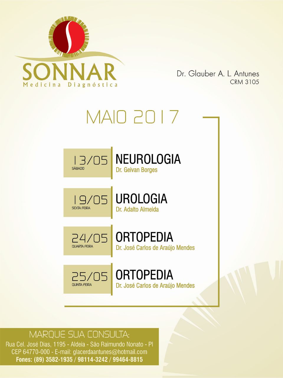 A Clínica Sonnar vai receber atendimentos de médicos ortopedista, neurologista, urologista e cardiologista durante esse mês de maio. Marque sua…